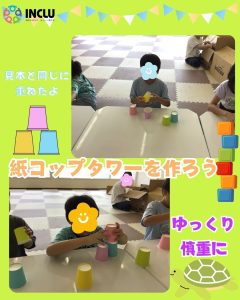最初は3つの紙コップを先生と同じように積む練習😃「右~左~」と声を掛けながら遊びの中で自然と方向のお勉強にもつながっちゃいます💪🏻