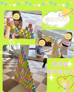 最後は全部の紙コップを使って巨大ピラミッド作りに挑戦🌟崩れるたび「キャー!」と笑いや悲鳴が飛び交いながらも「もう1回やろう!」とすぐに再チャレンジ❣️再考するまで何度も挑戦し、達成したときはみんな笑顔いっぱいでした☺️自由遊びの時間にも、一人で最後までピラミッドを作り切った子もいてその集中力には拍手👏🏻