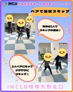 まず最初は1人でスキップのやり方を練習♪スキップのリズムや跳び方を伝えながら、繰り返し確認しました☆