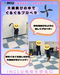 短縄を回すように手をぐるぐると動かしながら大縄跳びを行う運動です!