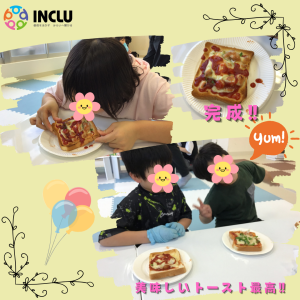 そして、オーブントースターでこんがり焼いたら… 「完成!!」 焼きたての香ばしいピザトーストに、みんなの目がキラキラ!✨ 「おいしいー!」「最高のピザトースト!」と、自分で作ったとびきりの味に大満足の様子でした。