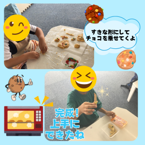 次に、生地を丸めて形作りをします♬「ハートの形にする!」「丸くしたいな~☆」様々な形に挑戦していました。チョコレートをトッピングすると「早く食べたい」と待ちきれない様子でした。
