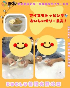 作ったゼリーの上にアイスやカラフルチョコ、シュークリームをトッピングして飾り付け🍨 みんなで「いただきます」をした後は、「おいしい~」といいながらみんな完食していました😋