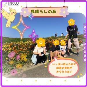コスモスやマリーゴールドなどの色とりどりの秋の花々の丘に登り、皆で記念撮影📷✨