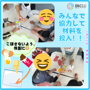 始める前に材料の確認から✅「牛乳を入れるんだよね🥛」「卵も使ってたよ🥚」と前回クッキー作りに参加した子は、振り返りをしながら発表してくれました💭