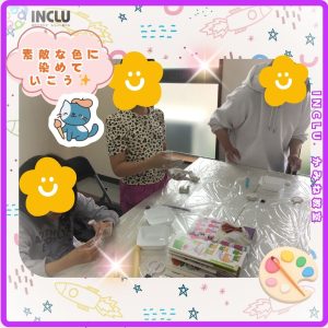 絵の具を使用して着色を…と思いきや、水の量や色の濃さが難しく、お子さんも職員も苦戦してしまいました!💦 皆で試行錯誤をしながら色の調整を行いました!