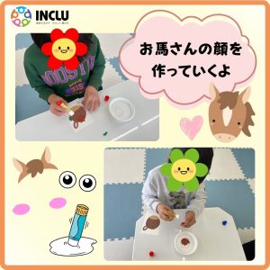 まずはお馬さんの顔を作っていきます!!お手本を参考に顔や耳などのパーツをペタペタと貼っていきます♪仕上げは好きな目を書いてもらうことに👀「どんな顔にしよう」「ニコニコ笑顔にしようかな」と言いながら描いていく子供たち☺とてもかわいく作ることができました(^^)/