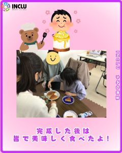 まずは皆で協力して材料を混ぜます🌀✊ホットケーキミックスや砂糖・バターや牛乳といった材料を使用しました!缶詰のシロップも使用することでより美味しさが増すようです🌟
