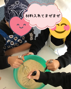 「ボウルを抑えた方がいいね?」「一緒にやろう😊」などお友達同士で協力し合う場面もあり、嬉しく思いました。焼き始めると「いい匂い~✨」「早く食べたいね♡」と目を輝かせていました☆