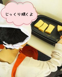 さあ!準備が整ったところで、調理スタートです👨🍳子ども達は、それぞれ担当を決め「パンを切る係」「卵液を作る係」「パンを卵液に浸す係」「パンを焼く係」に分かれました。