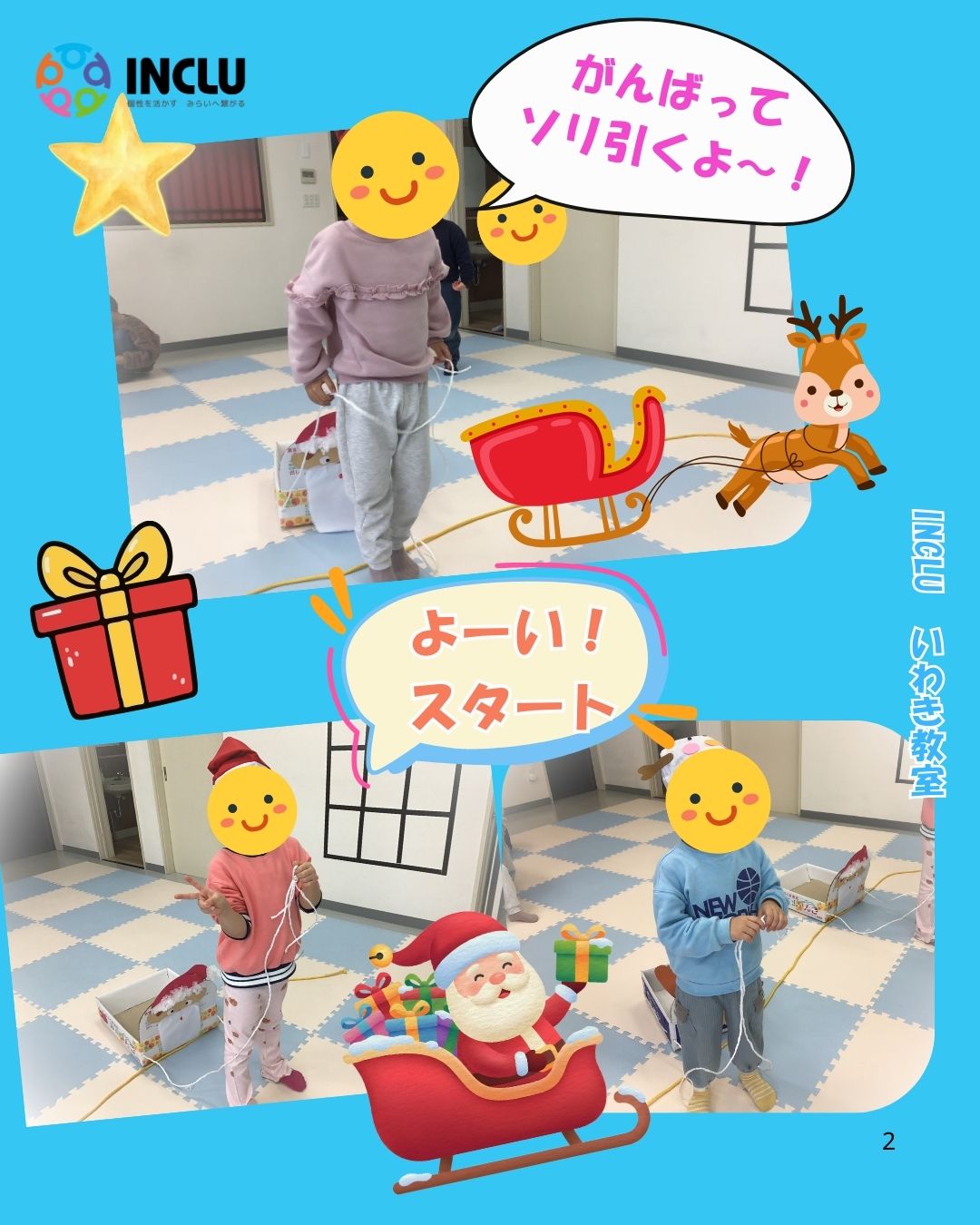 まずはサンタ🎅さんチームとトナカイさんチームに分かれてよーい!スタート!🚩の合図でソリを引きゴールまでたどり着くことが出来ました🛷