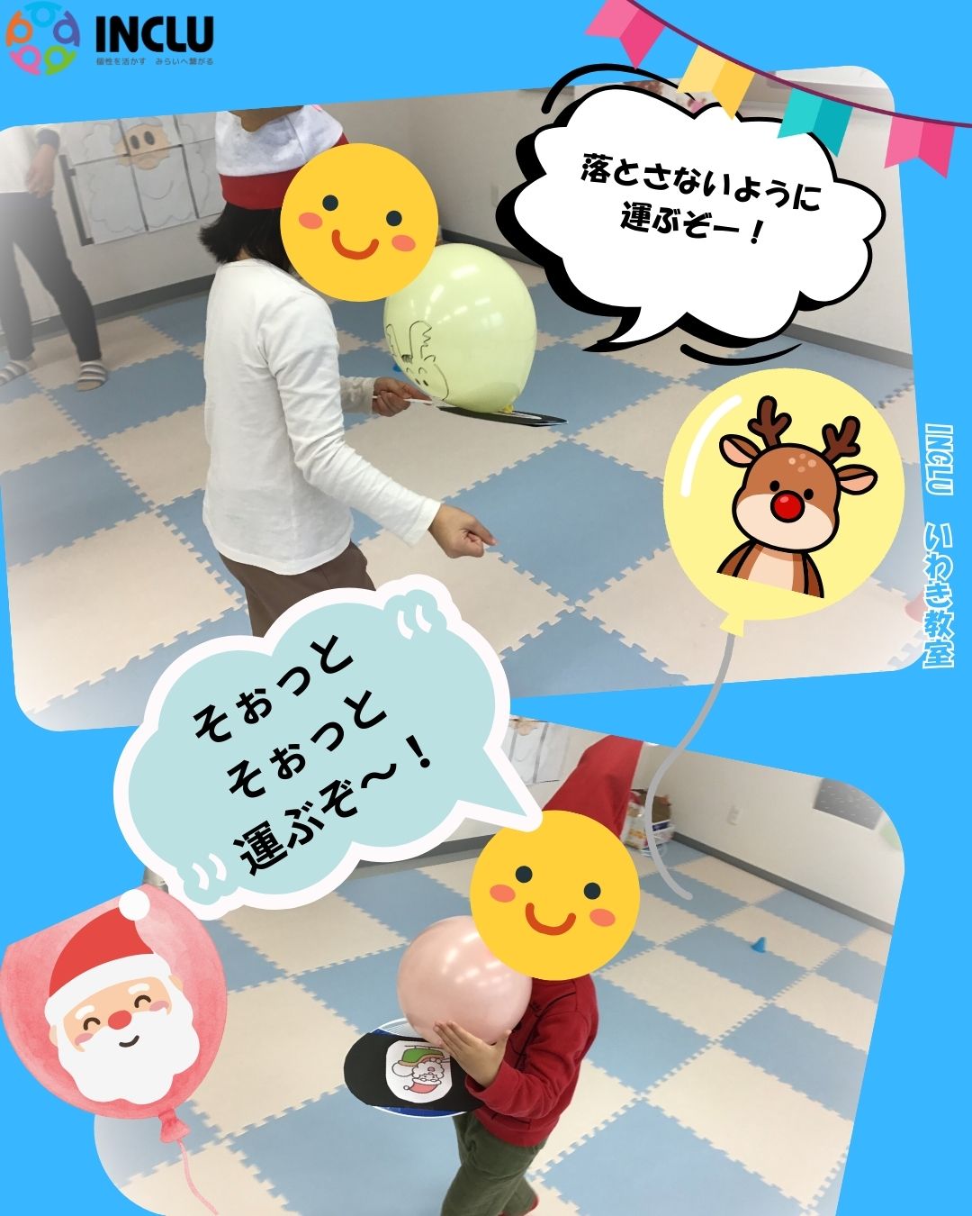 次にサンタさん🎅風船🎈運びレースをみんなで楽しく行いました♫みんなで風船を落とさないようにゆっくりと歩いて次のお友達に渡すことが出来ました😊みんなの応援で沢山盛り上がりました♫
