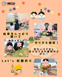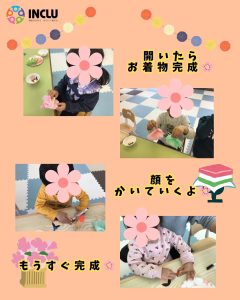 お内裏様とお雛様のお顔を描いたり、着物をお花紙で折ったりしました。蛇腹折りが難しそうな子もいましたが一生懸命指先を使ってつくっていきます。『かわいくできた!』『こんな顔もいいかな~‼』とそれぞれ素敵な作品が完成しました。