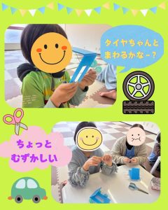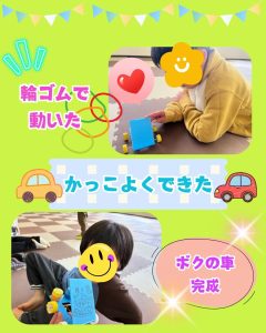 途中でタイヤが外れたり、輪ゴムがうまく引っかからなかったりする場面もありましたが、職員と一緒に原因を考え、修正しながら完成を目指しました。完成後輪ゴムを巻いて手を離すと、車がスーッと前に進み、「動いた」「すごい!」と歓声が上がりました👏🏻
