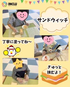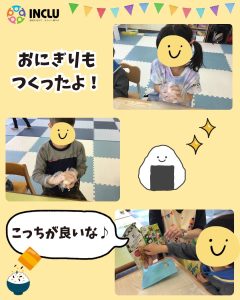 サンドイッチは自分で具材を選んで、パンに塗っていきます。ジャムやツナマヨを食パンに塗って、自分だけのサンドイッチの完成!おにぎりを作るときも、自分でふりかけを選んで作りました😊